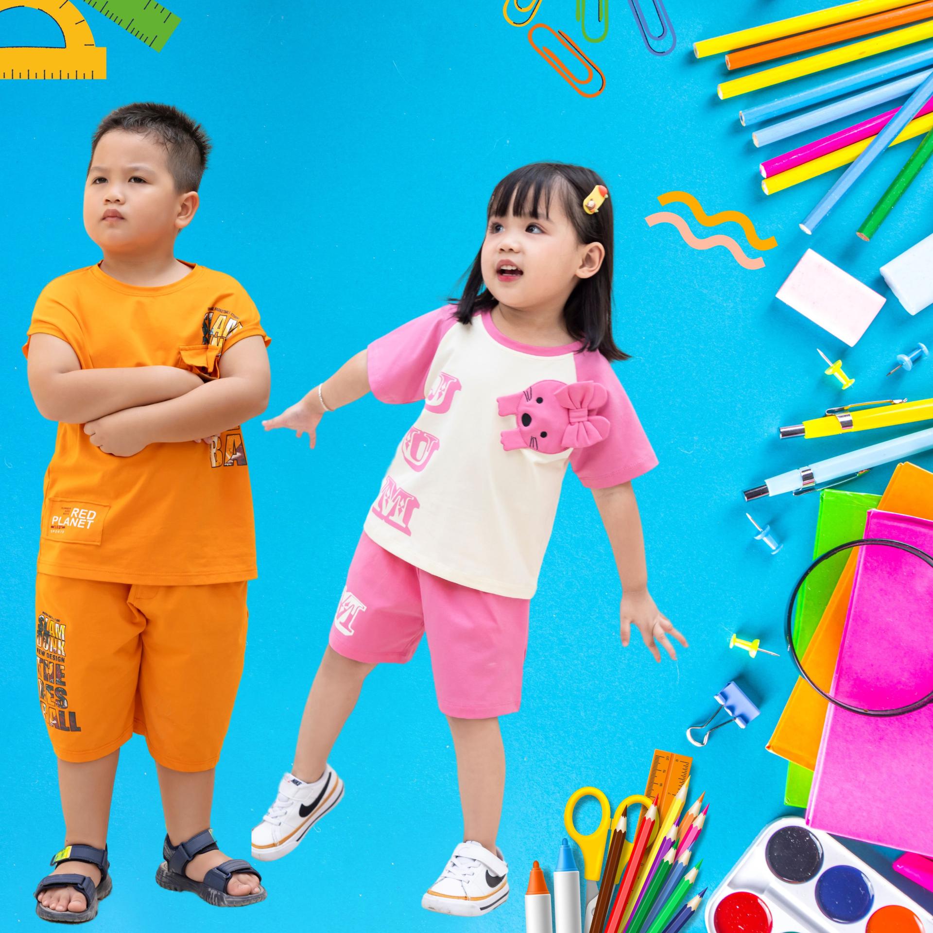 Khi phối đồ đi học cho bé, mẹ có thể chọn áo thun trơn hoặc họa tiết đáng yêu, kết hợp với quần shorts có màu sắc tươi sáng để tạo nên bộ trang phục năng động và sành điệu cho bé.