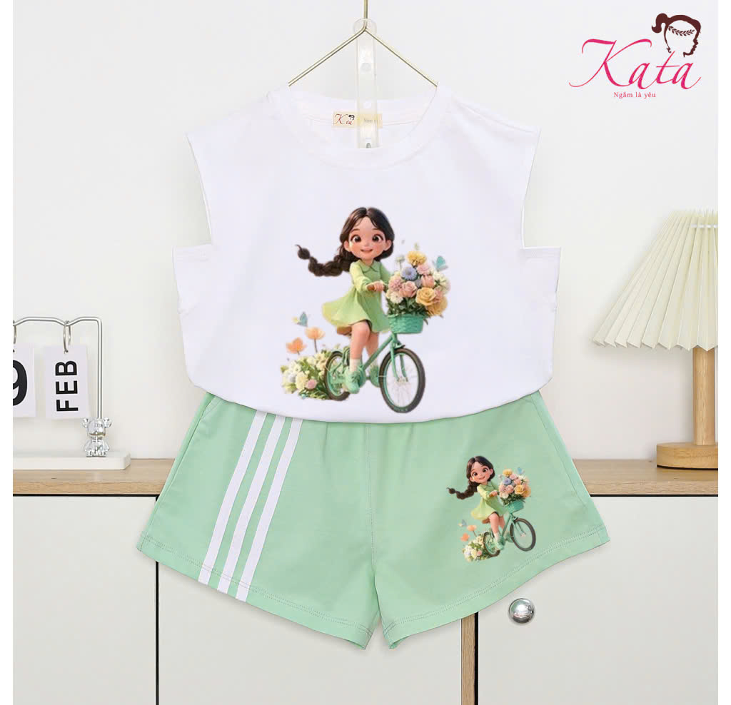 • Sản phẩm: Bộ bé gái Kata quần short 3 viền áo sát nách in bé gái chạy xe đạp